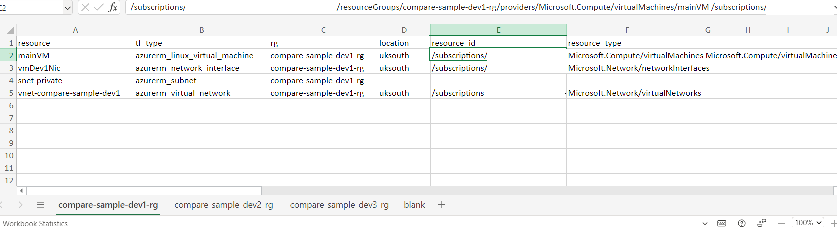 In this particular sample, I need to list out all those resources that will be created using Terraform where we do not have a state file. The product of this will be added to sheets, by Resource Group, in an Excel spreadsheet. Each sheet is an Azure Resource Group. The rationale for this is that at some point an apply was executed, and due to the state not being managed, we do not know if the current config matches with what has been deployed.