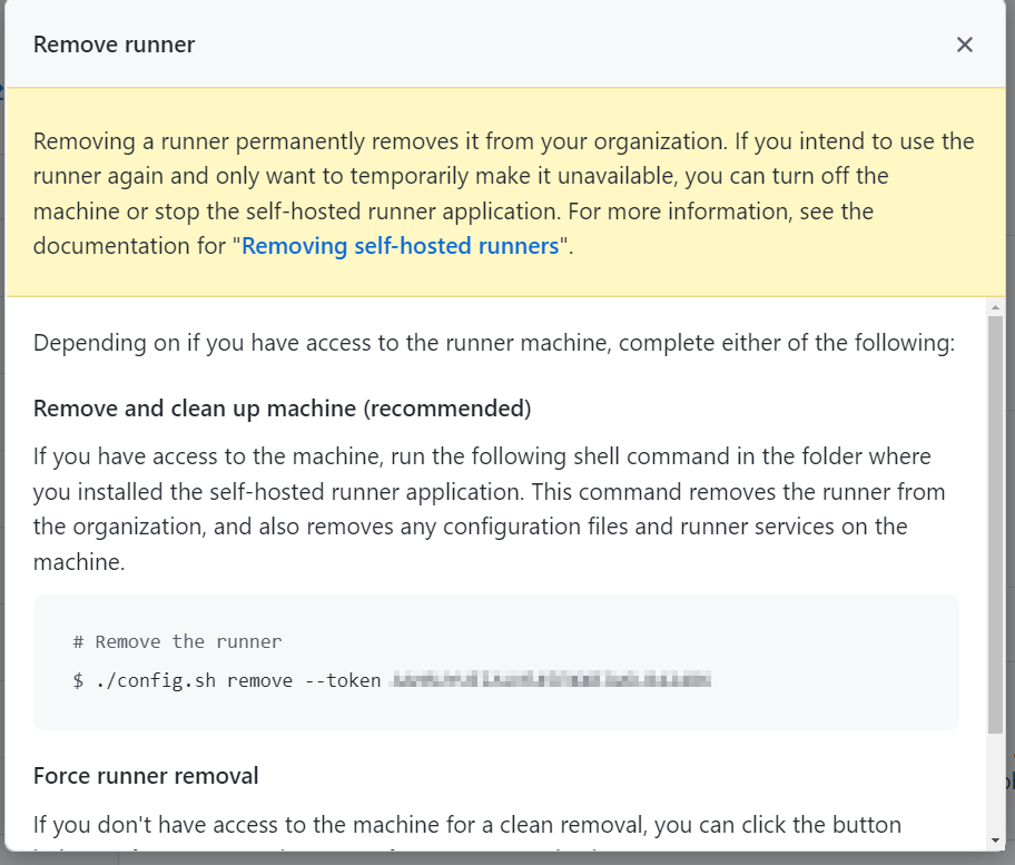 systemctl disable <service-name>Next, I returned to the GitHub portal and navigated to the Runners page and selected the new Runner. What I’m aiming to do here is to get a token that I can use to remove the Runner from the new VM: