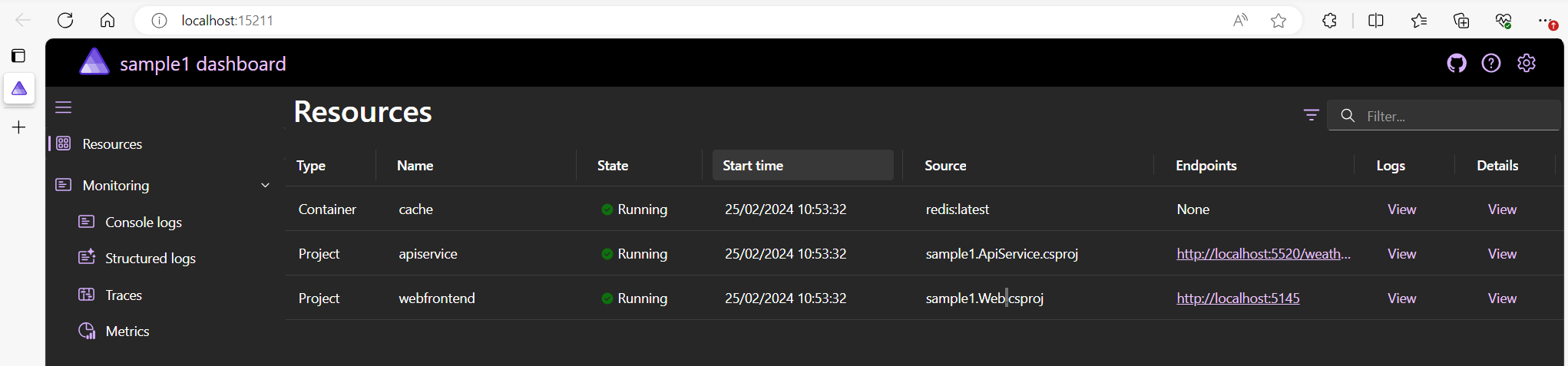 caption=".NET Aspire dashboard" >}}This particular example will produce this output: