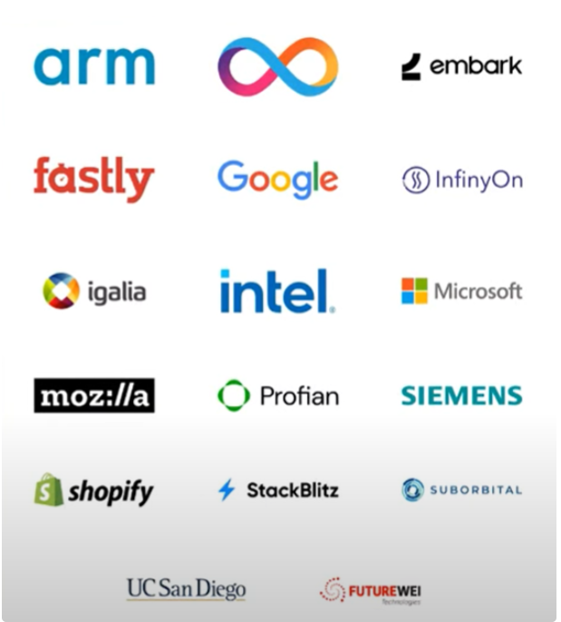 For example, you may want to access the host’s filesystem (or what the host would like you to think is its filesystem) or to read the system clock. Infact there are a range of resources your WASM application may want to access from its host. This access will need to be performed irrespective of what O/S you’re on, or what its instruction set is. This range of access is known as the API. To help in the development of this API and to ensure there’s an associated standard, the Bytecode Alliance was formed and became responsible for driving this forward. The Bytecode Alliance consists of an alliance of many organisations, as seen here: